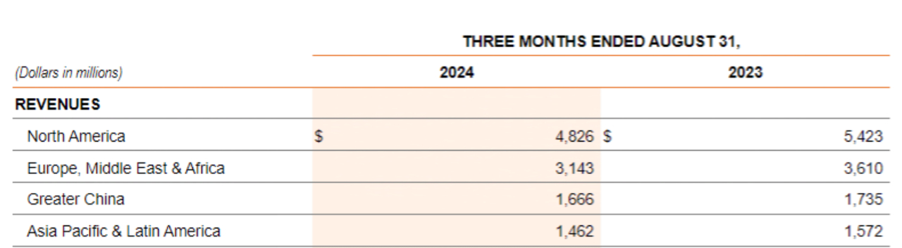 耐克第一财季业绩同期对比。(图片截自耐克财报)