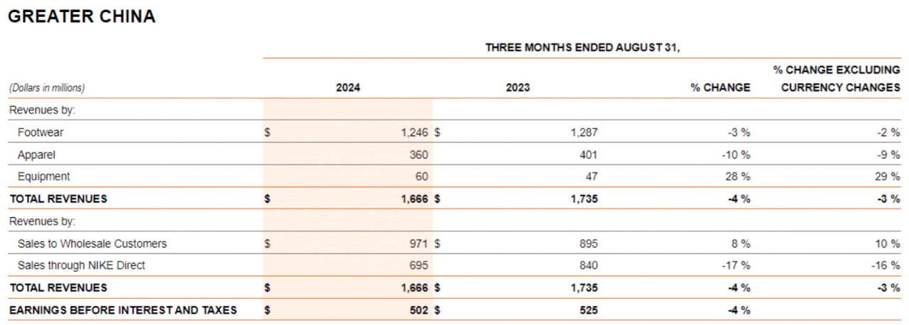 财报显示,第一财季,耐克实现营收116亿美元,同比下降10%;净收入为11亿美元,同比下降28%。值得关注的是,耐克大中华区业绩出现下滑,其在第一财季营收达到17亿美元,在汇率不变的基础上同比减少3%。