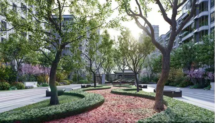 翡翠名筑的园林里,万物吐故纳新,繁花盛放,绿意盎然,满园的生机,尽显明媚、清新、浪漫。行走其间,整个身心都是美好且舒展的,让人觉得日子充满着无限的希望,也有着更多的期待。除了绿化,翡翠名筑还在园林的不同区域打造了异型汀步、跌级水景、中式连廊、景观绿岛、景观会客厅、对景景墙等,用来提升园林景观的层次感、丰富度。好的园林,不应只停留在赏心悦目上,还应该融入到居者日常的生活里。考虑到各个年龄层业主的休闲、运动、观赏、社交、亲子等多样性需求,翡翠名筑在园林中配置了丰富的休闲活动空间,让业主不单是旁观者,更是参与者,可参与景观,可感知生活。