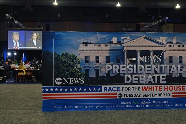 这张9月10日在美国费城总统辩论媒体中心拍摄的视频直播画面显示,哈里斯(右)与特朗普在费城参加电视辩论。