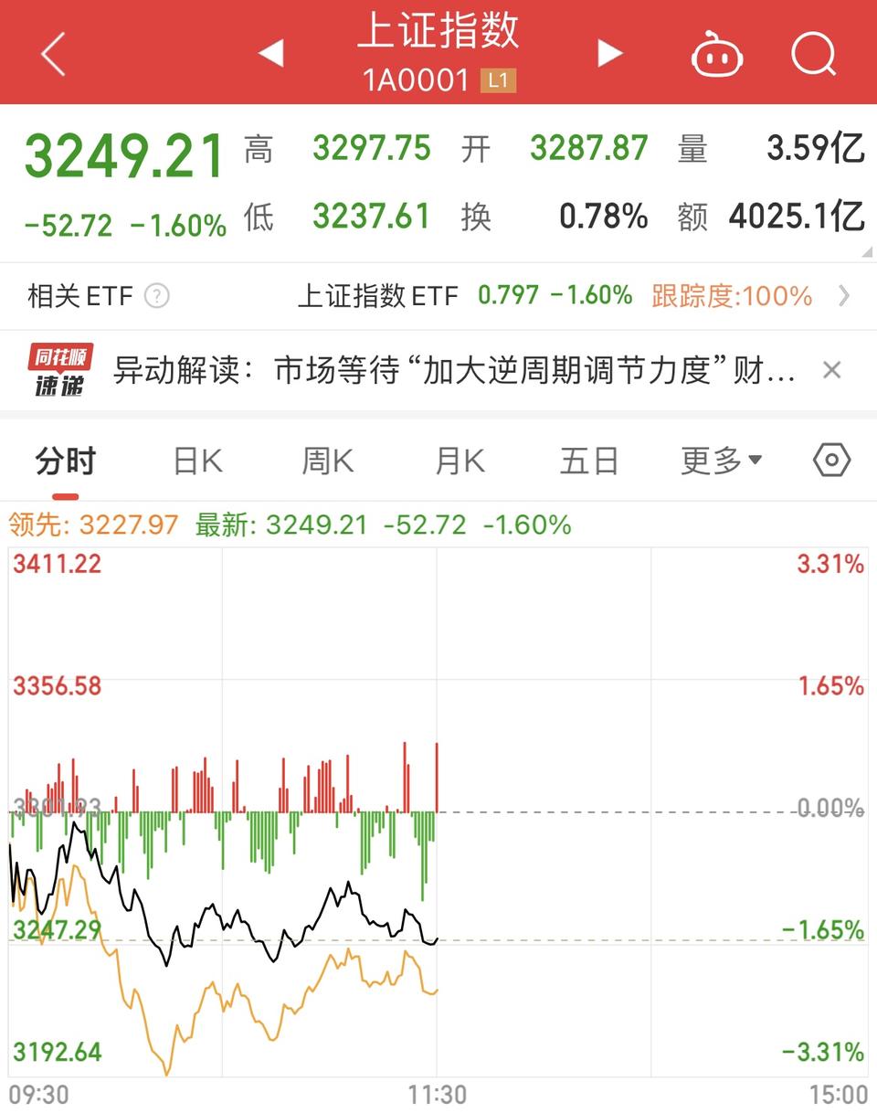 10月11日上午,A股继续调整,三大股指集体低开,沪指低开0.43%,报3287.87点,深证成指低开1.0%,创业板指低开1.77%。