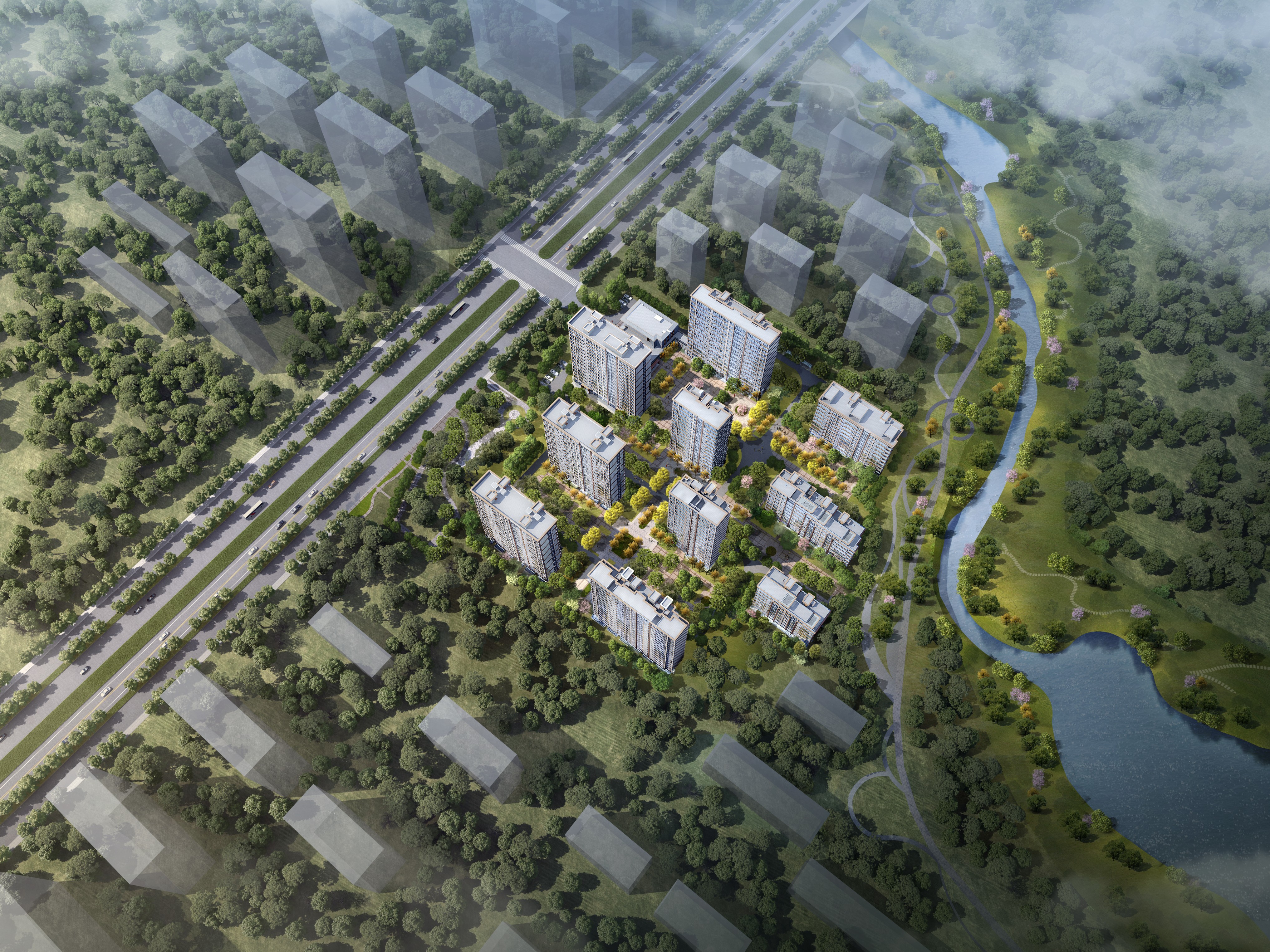 华安·凤鸣朝阳落址高新宜居之地,雄踞宝通街与北海路两大交通主干道,依白沙河中段曲水回环处而建,在潍坊临水而居的项目不少,但像凤鸣朝阳这般得河流环抱而生,又享河流中段最盛风景的项目却凤毛麟角,与此同时,凤鸣朝阳左右相靠传说中的凤凰山与九龙山,咫尺千亩植物园,自然禀赋得天独厚。“山环水抱”的凤鸣朝阳,如同一座超凡脱俗的“岛境住区”,身隐于城,淡然高贵,兼得逸趣、自然与诗意。