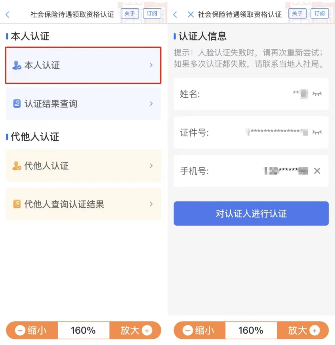 第二步,确定认证人员。若本人认证,选择“本人认证”,确认姓名、证件号、手机号等信息,点击“对认证人进行认证”,扫脸眨眼即可。认证完成会提示认证成功,并显示下一次的认证截止时间。
