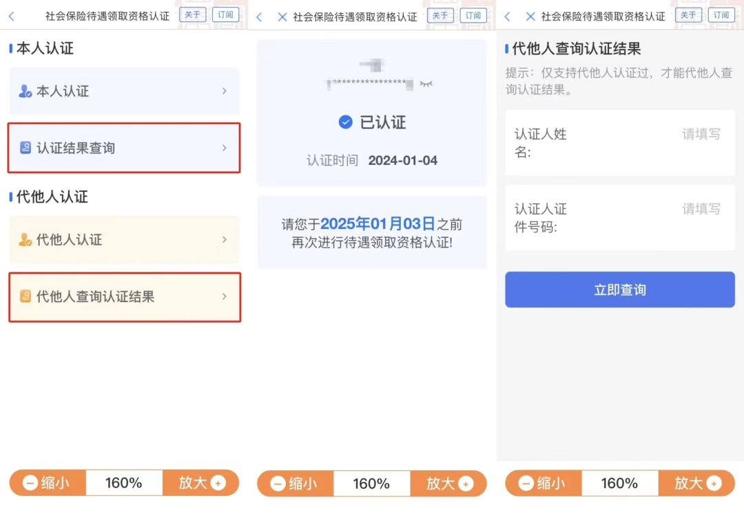 第三步,认证完成后,可以进行认证结果查询。本人认证将直接显示认证时间,代他人认证需先填写认证人姓名及证件号码后进行查询。