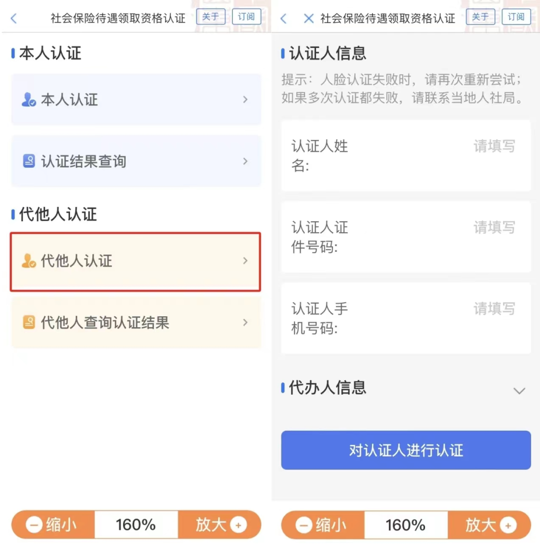 如需为父母及其他退休人员代办认证,选择进入“代他人认证”,填写认证人的姓名、身份证号、认证人或亲属的手机号等信息,点击“对认证人进行认证”,对待遇领取人员进行刷脸认证。认证完成会提示认证成功,并显示下一次的认证截止时间。(需要特别注意的是,此处需对退休人员本人进行刷脸认证)