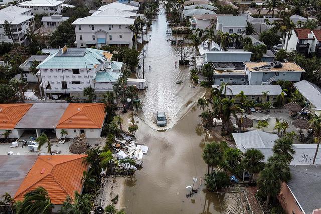 当地时间2024年10月10日,美国佛罗里达州西埃斯特基,飓风 “米尔顿” 过后一辆汽车行驶在被洪水淹没的街道上。