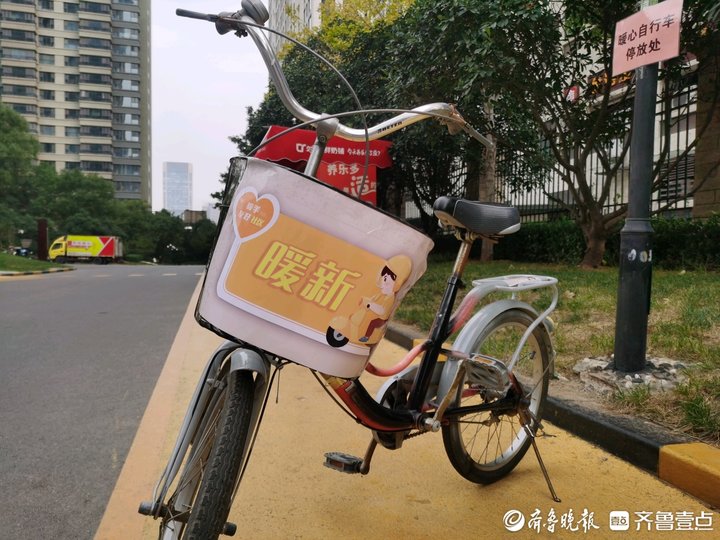 12日上午,在济南市历下区恒大帝景小区内,外卖小哥将电动车停放在固定停车处,换成社区内的“暖新自行车”进入小区送外卖。