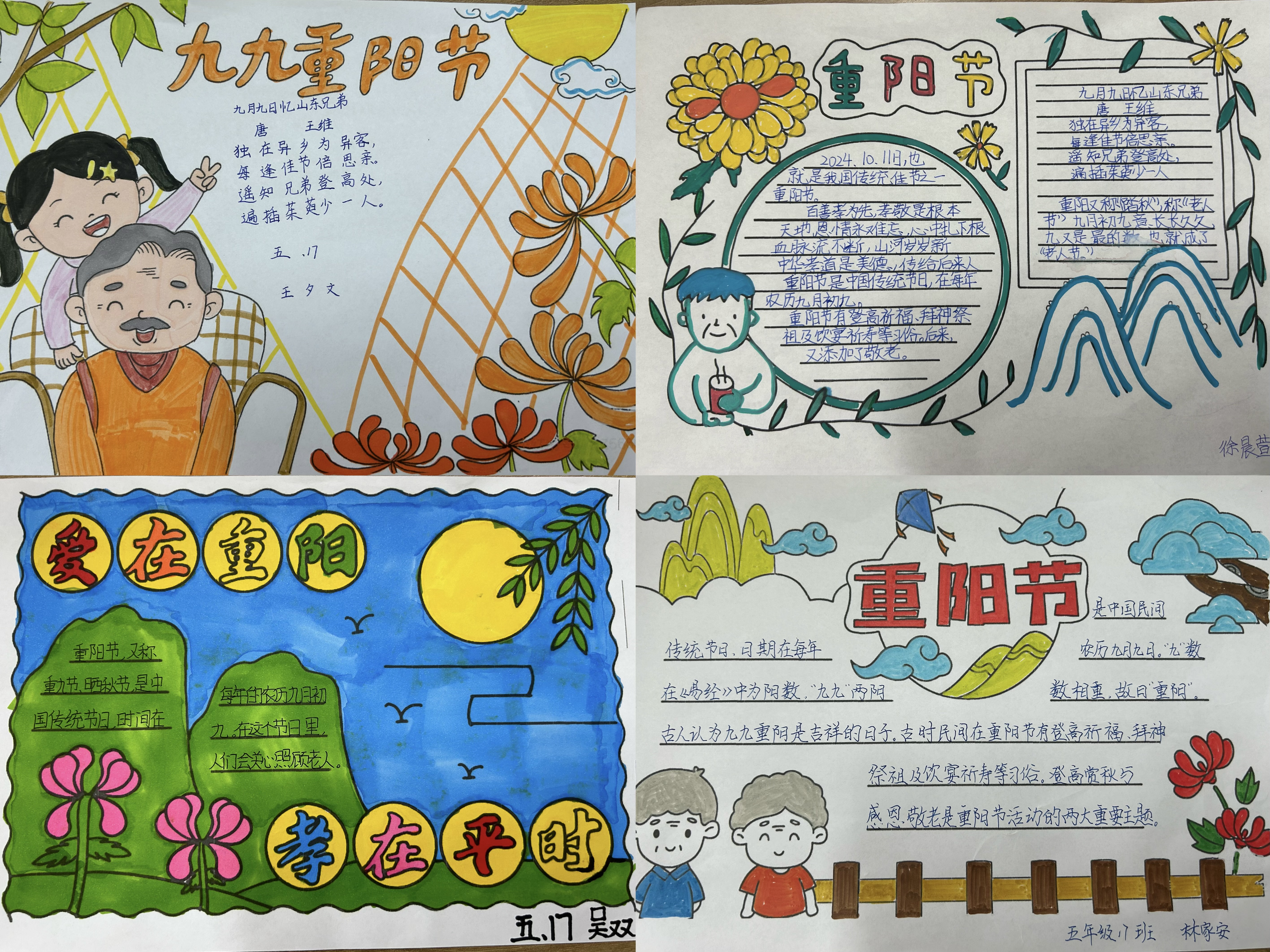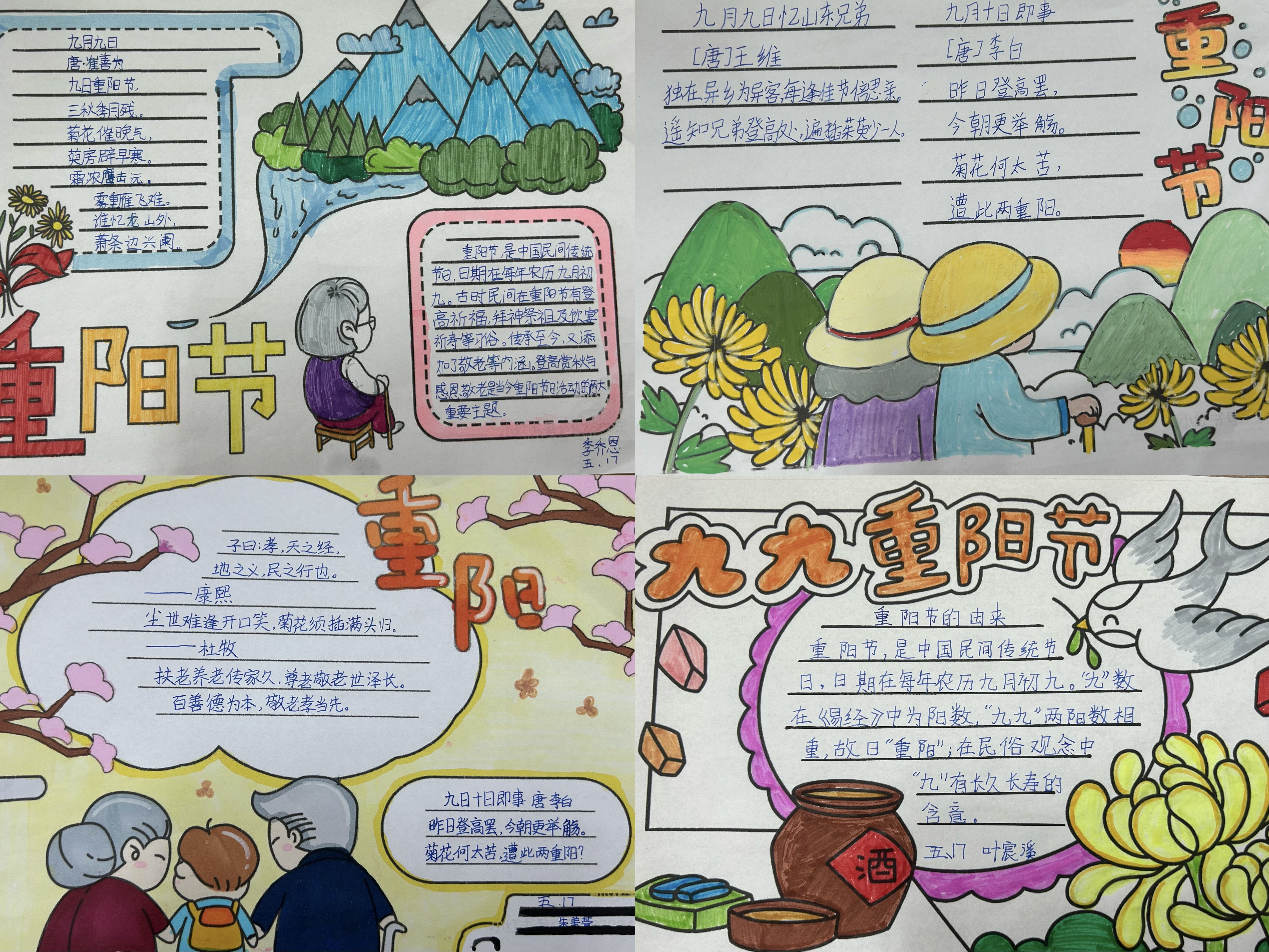 同时,学生们还根据自己的所见所感,精心绘制了重阳节手抄报。手抄报内容丰富多样,有的描绘了重阳节的传统习俗,有的记录了与长辈共度重阳的美好时光,还有的则表达了对长辈的深情祝福。每一份手抄报都凝聚着学生们的心血与创意,展现了他们对重阳节文化的热爱与传承。