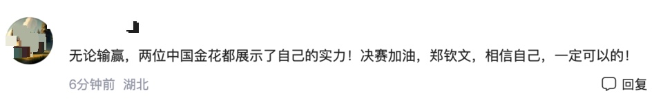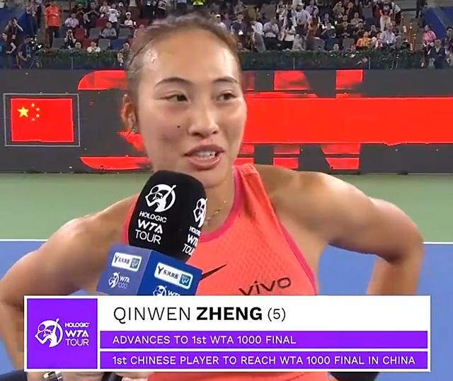 郑钦文:本场比赛现场平等的给我们加油,这种感觉还不赖,之前打外国选手,加油声都是一边倒,还是要适应一下,很高兴挺进武网决赛。