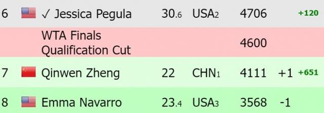 郑钦文赢球后,冠军积分来到4111分,领先第八的纳瓦罗543分,距离第六的佩古拉595分。今年前七和克雷吉茨科娃将进入年终总决赛。