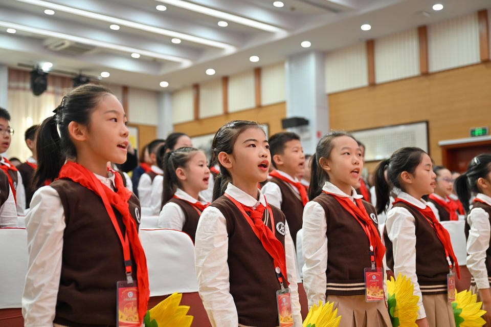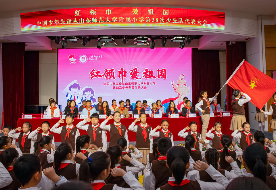 10月12日,中国少先队建队75周年之际,山东师大附小1763名少先队员迎来第三十八次少先队代表大会。大队旗手护卫着中国少年先锋队队旗缓缓步入会场,全体少先队员唱响《中国少年先锋队队歌》。