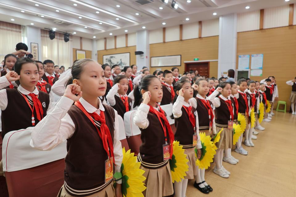 经过紧张的现场投票和票数统计,本次少代会选举产生了新一届大队委员。与会嘉宾将大队委标志佩戴在他们左肩后,新一届大队委员和全体少先队员代表重温入队誓词。