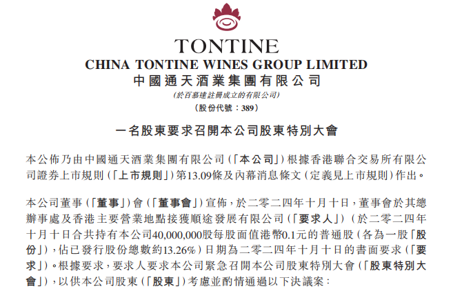 近日,通天酒业发布公告称,公司董事会接获股东顺途发展有限公司书面要求,要求紧急召开股东特别大会以考虑并酌情通过十项决议案,其中一项为罢免公司董事会主席王丽君。