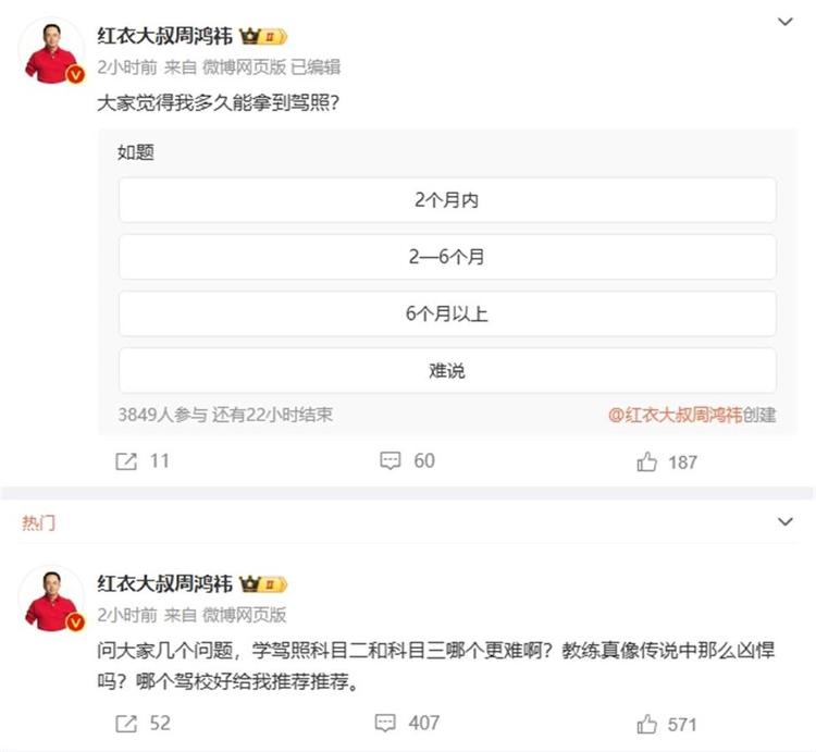 10月14日早间,360集团创始人、董事长周鸿祎在微博发文透露将考驾照,并向网友提问:科目二和科目三哪个更难,哪个驾校好,教练真像传说中那么凶悍吗?哪个驾校好给我推荐推荐。他还在微博发起投票,让网友猜测他多久能拿到驾照。