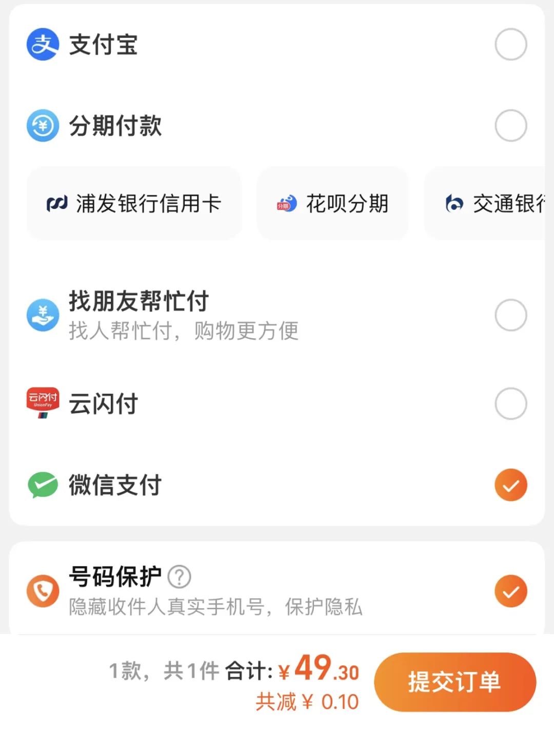 10月13日,记者实际操作发现,在淘宝完成商品选购后,从支付页面选择“微信支付”即可完成支付,支付体验与其他支付方式一致。