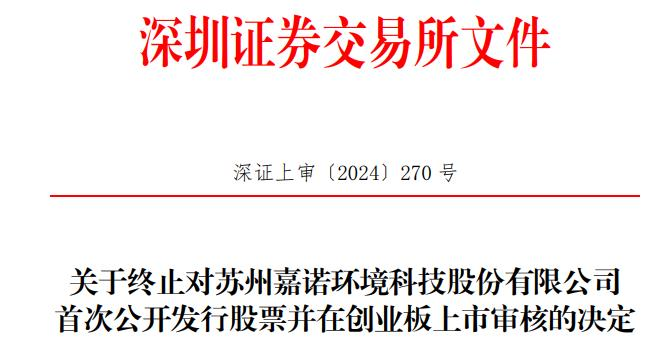 中国经济网北京10月16日讯 深交所网站日前公布关于终止对苏州嘉诺环境科技股份有限公司(简称“嘉诺科技”)首次公开发行股票并在创业板上市审核的决定。