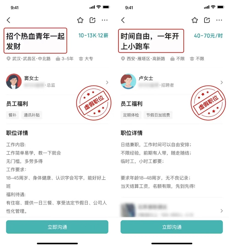 这类虚假职位,通常不是以诈骗为目的,大多不会对求职者的人身安全和财产安全造成威胁,却侵犯了求职者的知情权,严重影响了蓝领的求职体验。