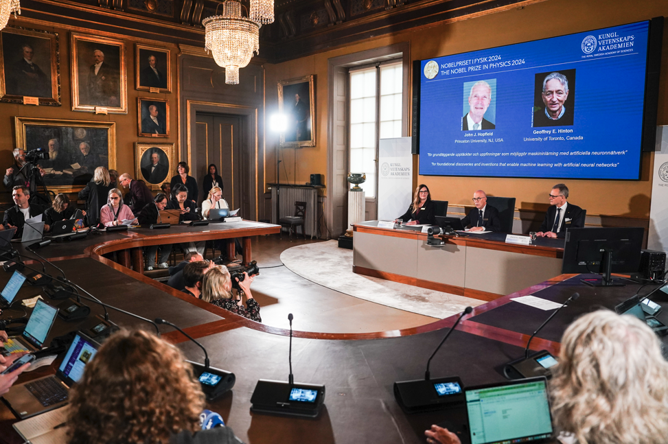 10月8日,在瑞典斯德哥尔摩举行的2024年诺贝尔物理学奖公布现场,屏幕显示奖项得主为美国普林斯顿大学的霍普菲尔德和加拿大多伦多大学的欣顿。 新华社发