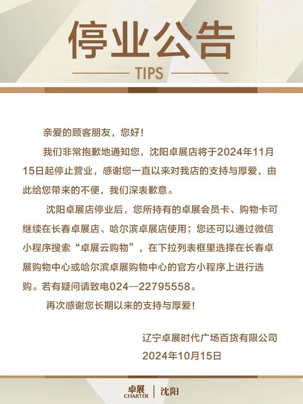 10月16日,沈阳卓展购物中心发布停业公告,该商场将于2024年11月15日起停止营业。