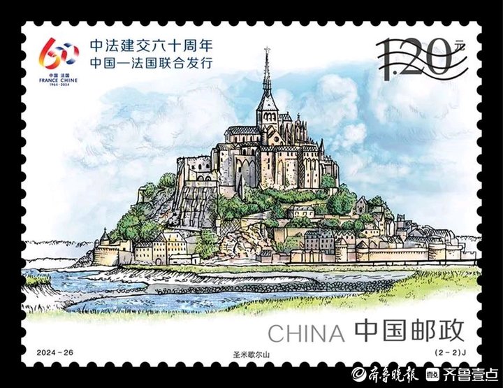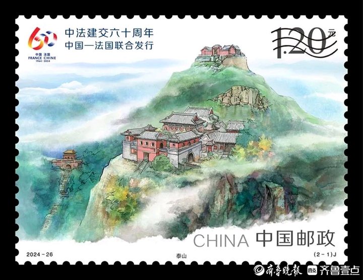 本次与法国联合发行的《中法建交六十周年》纪念邮票1套2枚,邮票图案名称分别为泰山和圣米歇尔山。