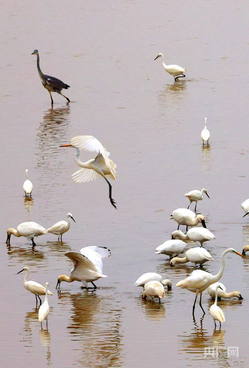 当天早上8点,记者在鄱阳湖鞋山水域,发现有白琵鷺、苍鹭以及普通鸬鹚等20多种越冬候鸟,数量达到1000多只。它们时而低头觅食、时而追逐嬉戏、时而翩翩起舞、时而掠水低飞,构成了一幅幅优美动人的生态画卷。