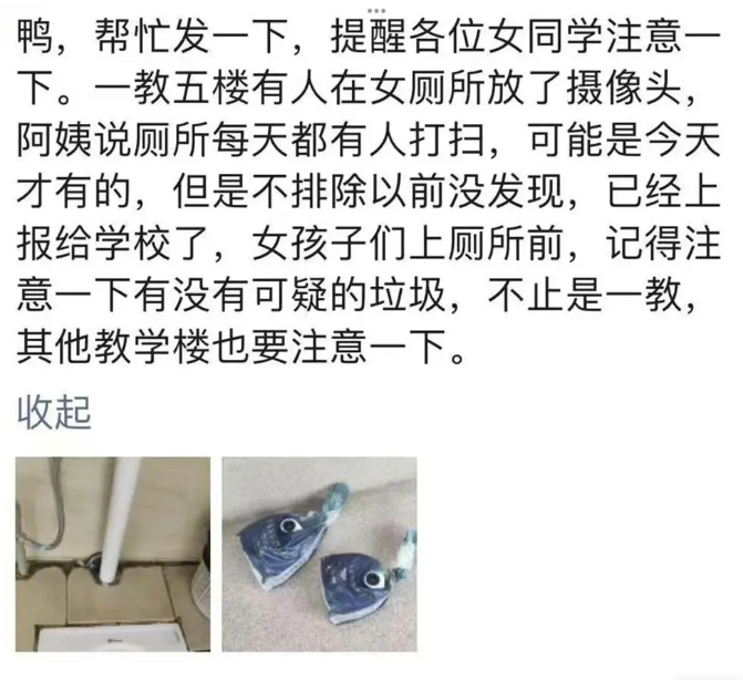 近日,广东高校肇庆学院的校园墙有人曝光称,在教学楼女厕所发现摄像头。