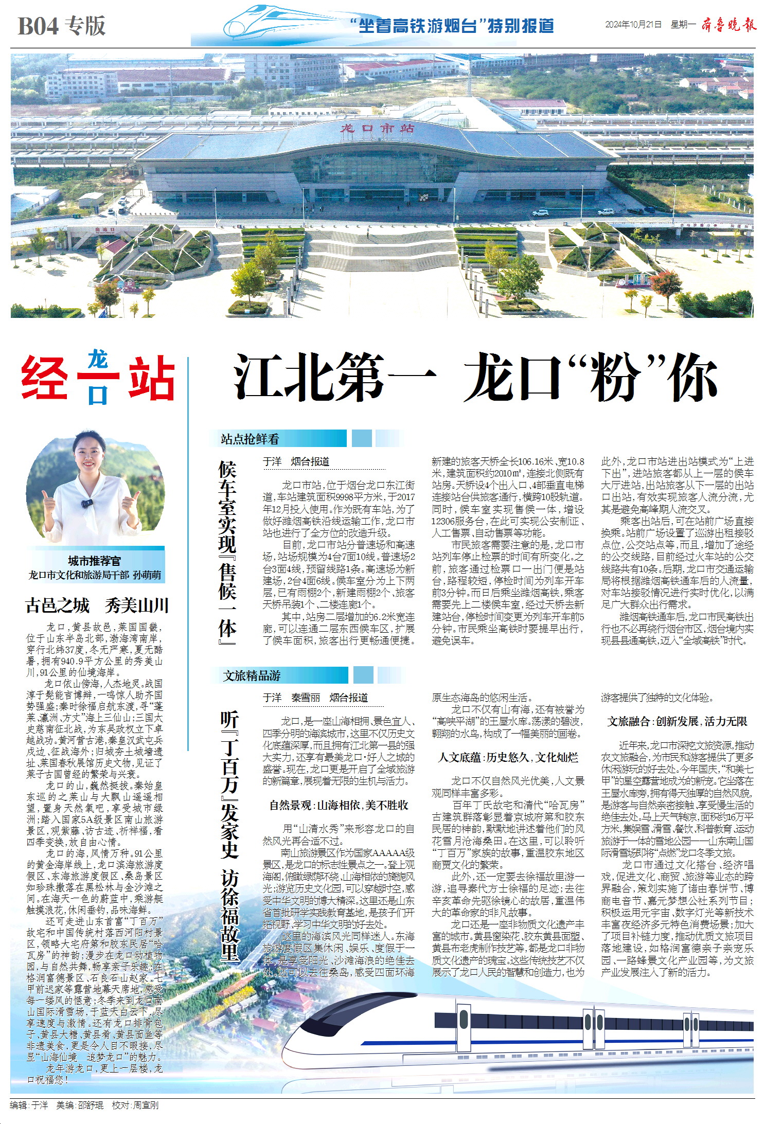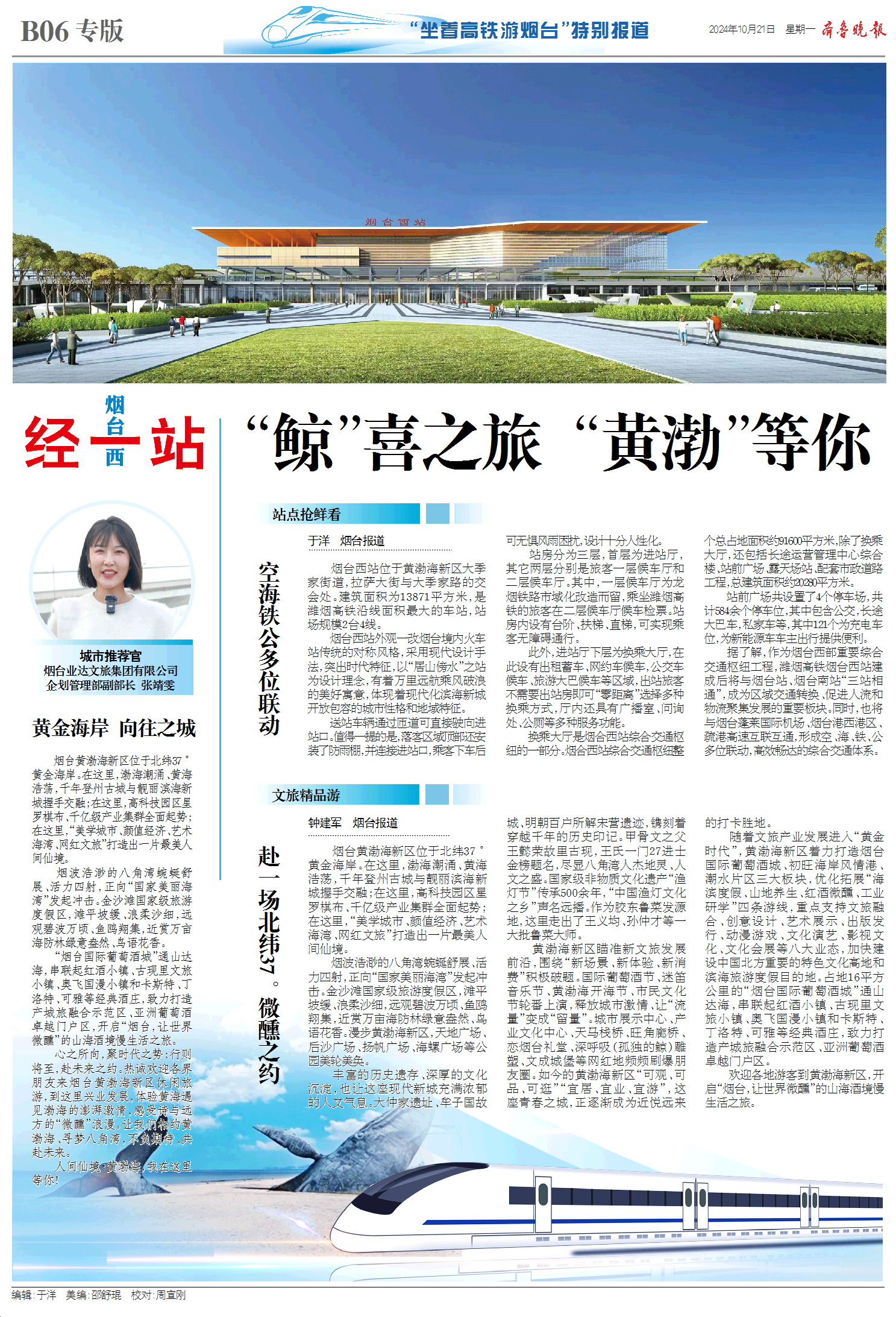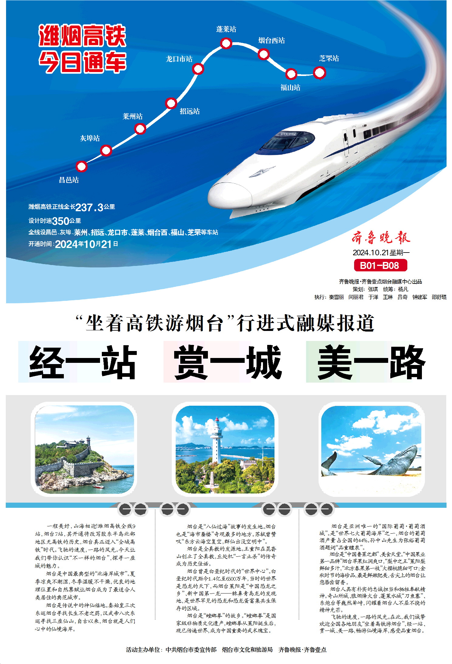 今天,齐鲁晚报推出8个整版的“坐着高铁游烟台”——潍烟高铁开通行进式融媒报道特刊,报道以大交通为切入口,探访潍烟高铁烟台境内7大车站以及周边文旅资源,讲好“仙境海岸 品重烟台”城市故事,面向全国游客发出仙境邀请。