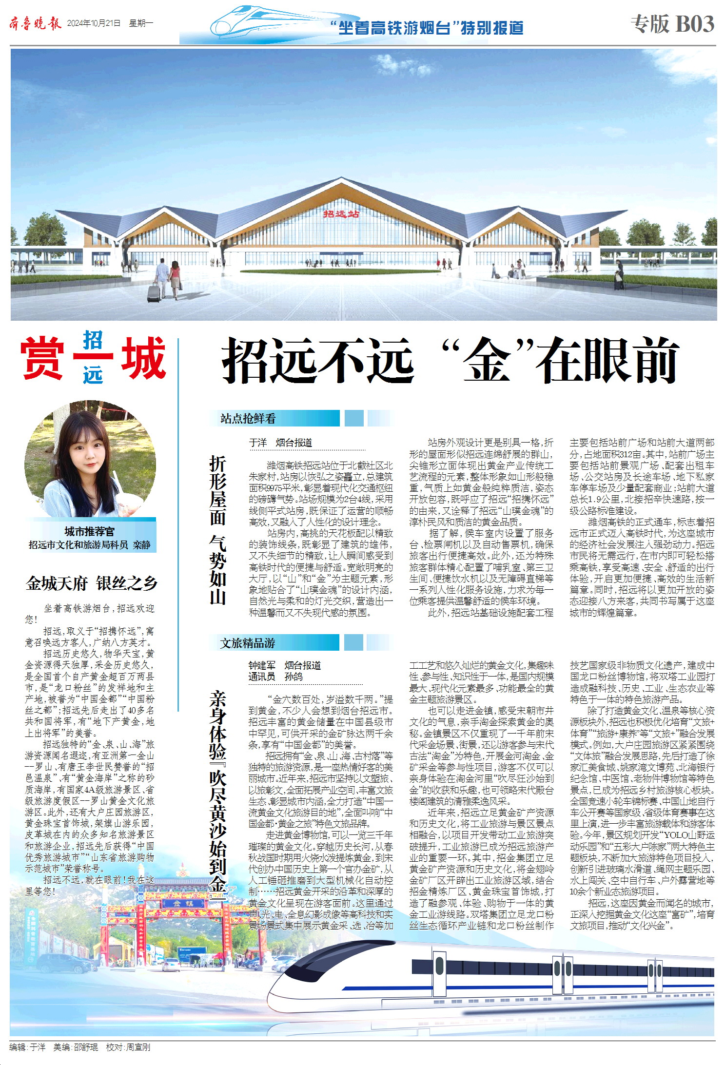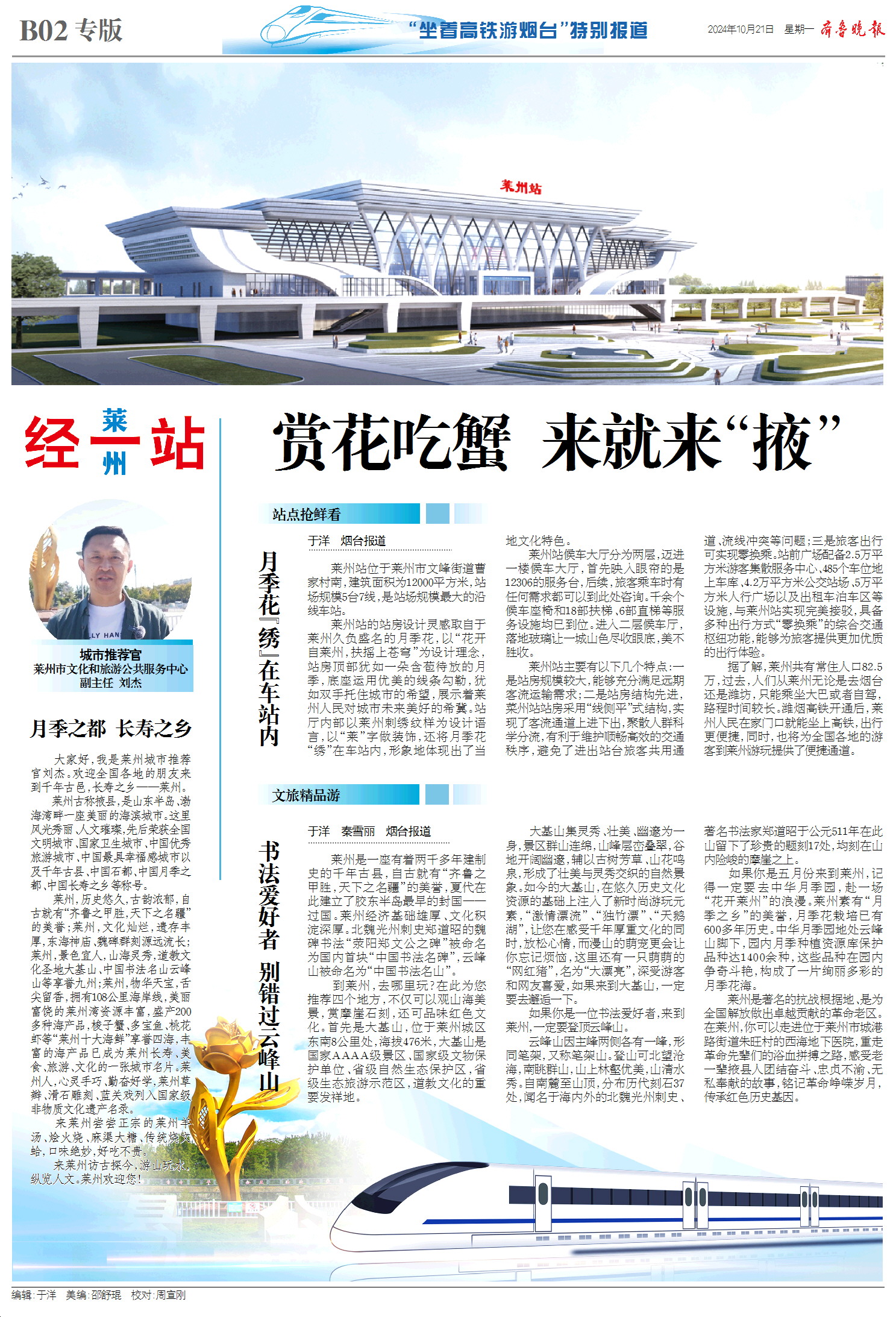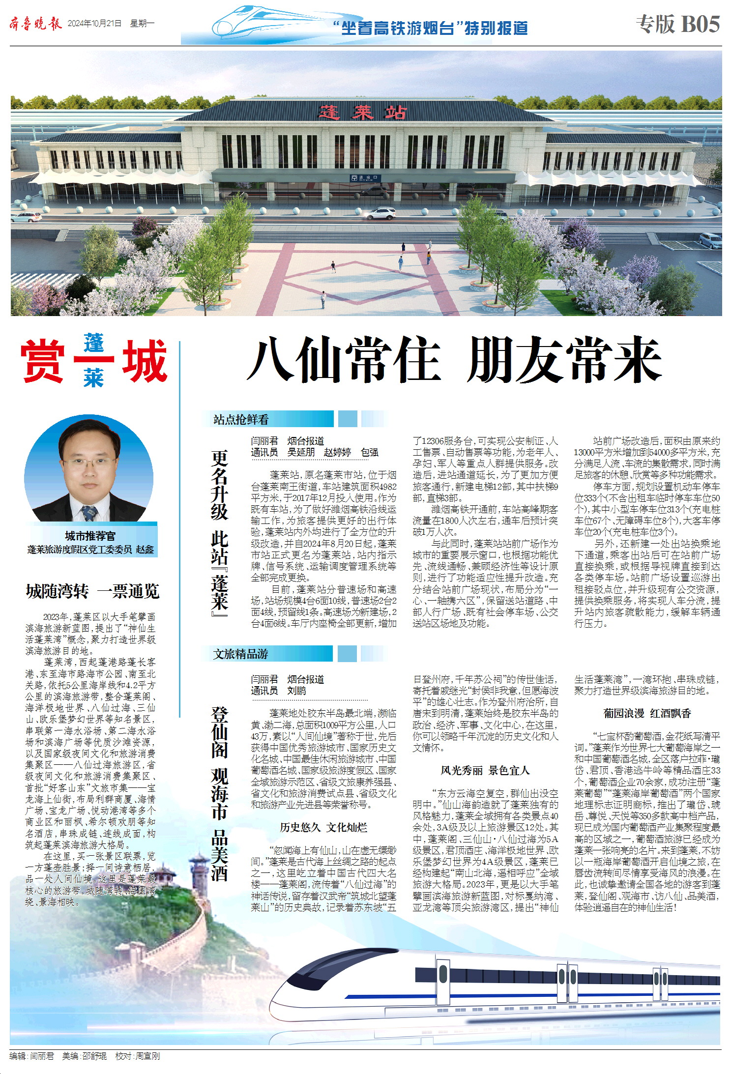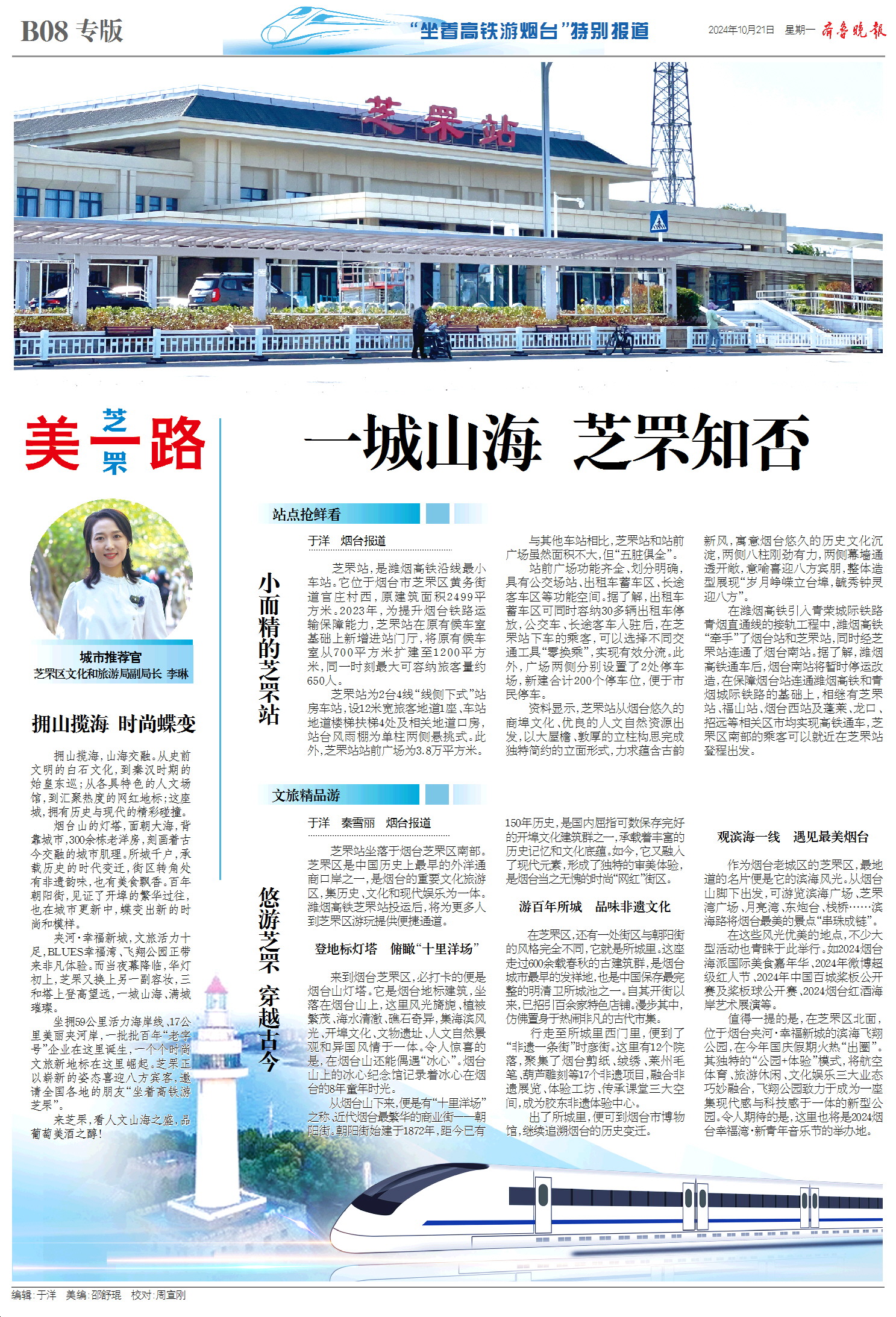 今天,齐鲁晚报推出8个整版的“坐着高铁游烟台”——潍烟高铁开通行进式融媒报道特刊,报道以大交通为切入口,探访潍烟高铁烟台境内7大车站以及周边文旅资源,讲好“仙境海岸 品重烟台”城市故事,面向全国游客发出仙境邀请。