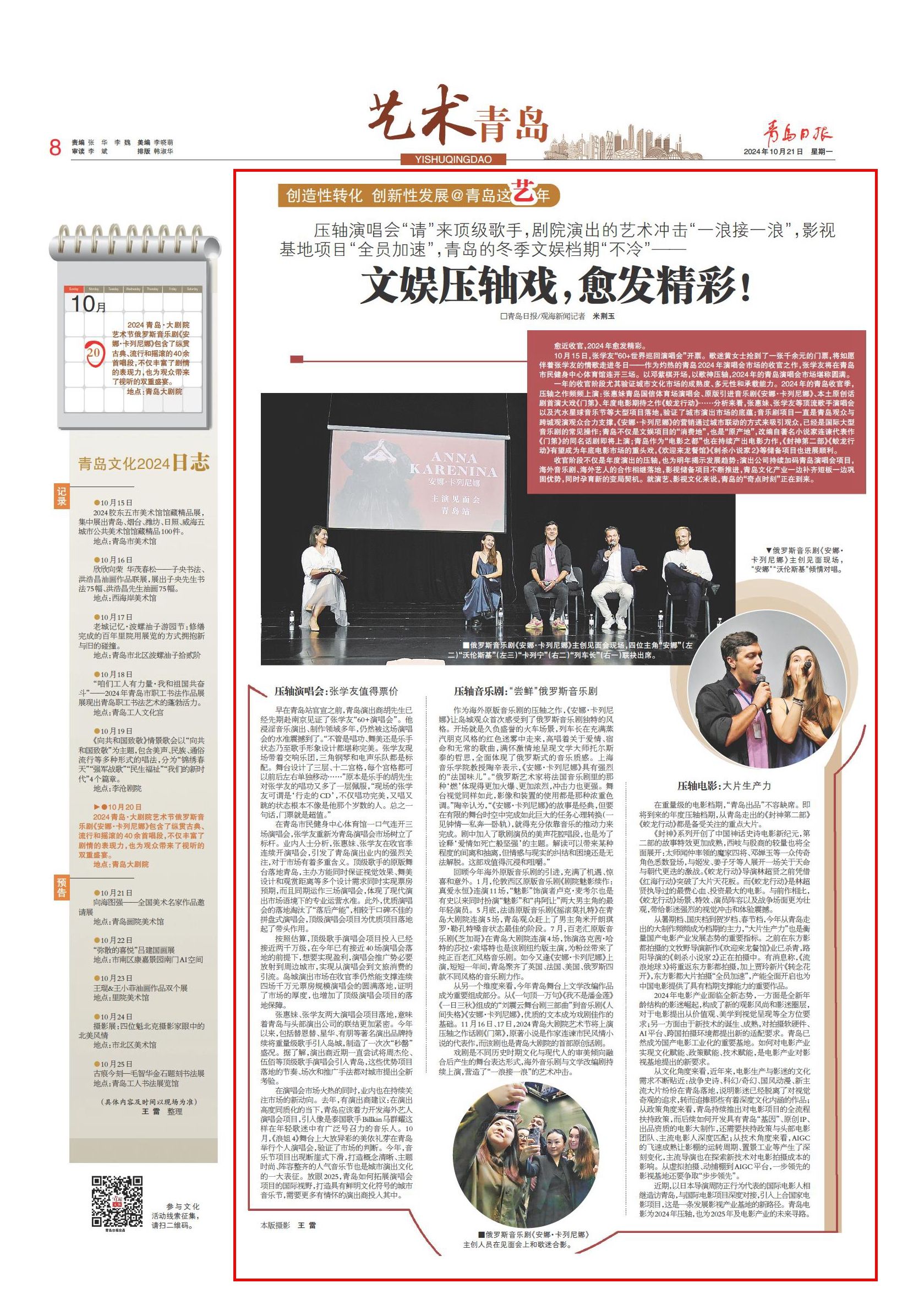 一年的收官阶段尤其验证城市文化市场的成熟度、多元性和承载能力。2024年的青岛收官季,压轴之作频频上演:张惠妹青岛国信体育场演唱会、原版引进音乐剧《安娜·卡列尼娜》、本土原创话剧首演大戏《门第》、年度电影期待之作《蛟龙行动》……分析来看,张惠妹、张学友等顶流歌手演唱会以及汽水星球音乐节等大型项目落地,验证了城市演出市场的底蕴;音乐剧项目一直是青岛观众与跨城观演观众合力支撑,《安娜·卡列尼娜》的营销通过城市联动的方式来吸引观众,已经是国际大型音乐剧的常见操作;青岛不仅是文娱项目的“消费地”,也是“原产地”,改编自著名小说家连谏代表作《门第》的同名话剧即将上演;青岛作为“电影之都”也在持续产出电影力作,《封神第二部》《蛟龙行动》有望成为年底电影市场的重头戏,《欢迎来龙餐馆》《刺杀小说家2》等储备项目也进展顺利。