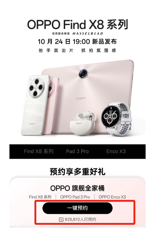 OPPO Find X8系列将于10月24日登场,截至目前,该系列在OPPO官网预约人数突破62万,人气火爆。