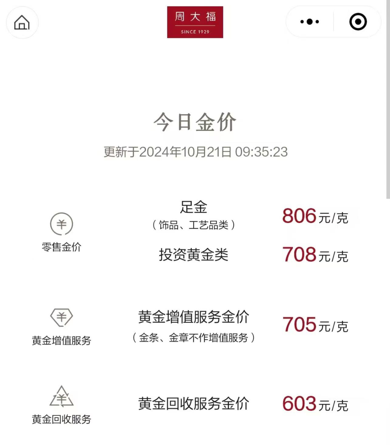 10月20日,记者从周大福、老凤祥、周生生、潮宏基等品牌店的官方公众号了解到足金饰品的金价均已突破800元/克。其中,周大福、周六福足金首饰价格为806元/克。