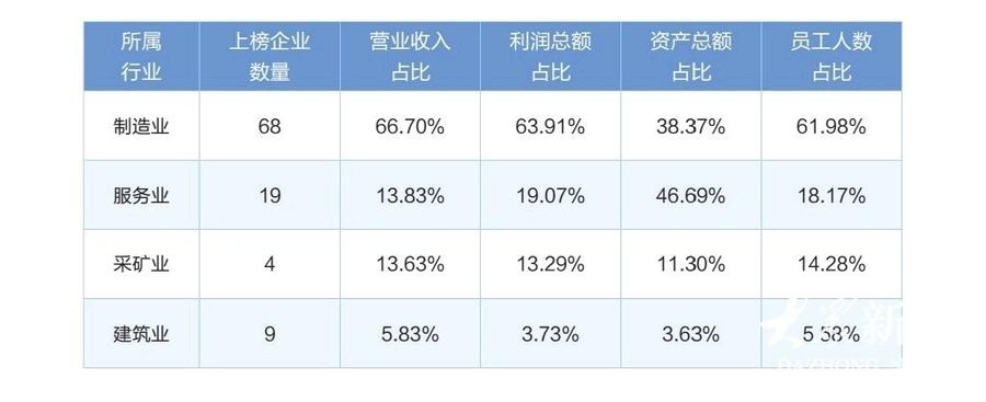 今年的山东百强企业中,共有68家制造业企业上榜,服务业企业19家,建筑业企业和采矿业企业分别为9家和4 家。制造业企业在营业收入、利润总额、员工人数等主要指标上占比均超过60%。服务业企业则在资产总额指标上优势明显,占比约47%。