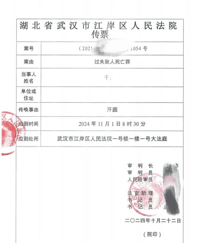 武汉女子干婷(化名)遭丈夫碾轧拖拽死亡案有了新消息。10月22日晚,死者父亲干先生告诉记者,该案将于11月1日在武汉市江岸区人民法院一审开庭。记者从法院传票显示,该案案由是“过失致人死亡罪”,开庭时间为11月1日上午8点半。