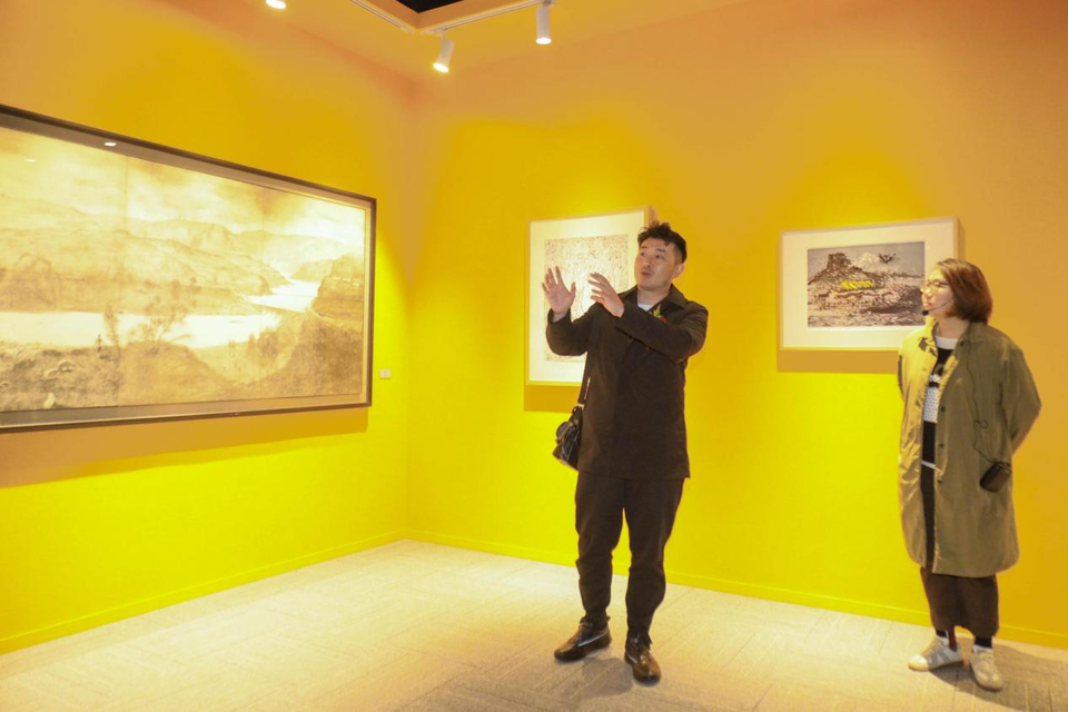 开幕式结束后,到场领导及嘉宾进行合影。随后与会嘉宾及现场观众步入展厅,观赏艺术作品。本次展览策展人刘希言为现场嘉宾导览。