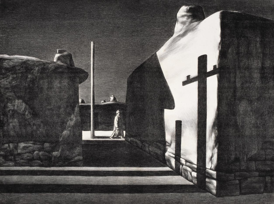 苏新平 《寂静的小镇之三》 53×68cm 石版单色 1989年 中央美术学院美术馆藏
