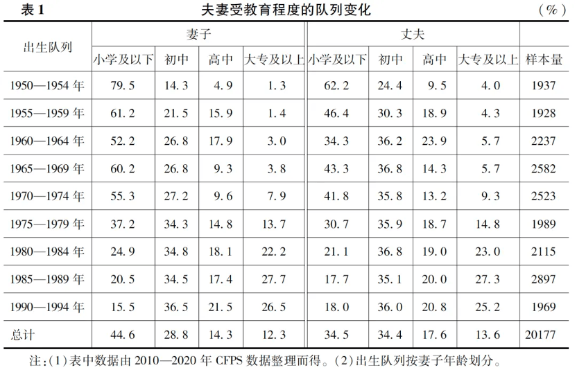 依据研究目的,该研究聚焦于夫妻样本,结合完成正规教育并进入婚育年龄的实际情况,选取了妻子出生于1950—1994年(即26~70岁)的夫妻样本,并以五年为一个单位,将其划分为九个出生队列进行分析。该文整合了2010—2020年的六轮数据,共涵盖20177对夫妻样本(个体样本达40354个),用于描述和分析夫妻教育匹配模式及其队列变化趋势。经过有效筛选和处理,最终有效样本量为12523对夫妻。