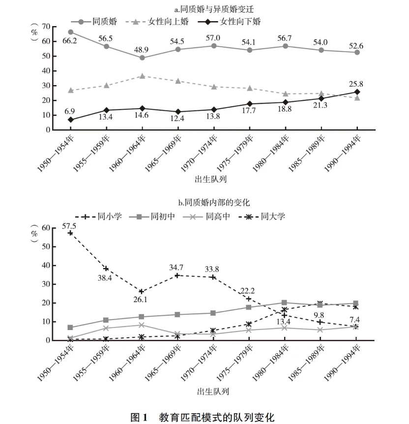 这项研究发现,中国传统教育“梯度婚”(妻子学历低于丈夫)正在减少,而高学历“同质婚”(夫妻双方学历一致)和女性“向下婚”(丈夫学历低于妻子)增多——在最年轻的出生队列(妻子出生于1990—1994年)中,“梯度婚”的比例已降至21.7%,而女性“向下婚”的比例则增加到了25.8%,2022年的一项研究中也曾发现2014—2018年结婚夫妇中女性“向下婚”占比已超过“向上婚”。