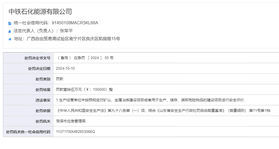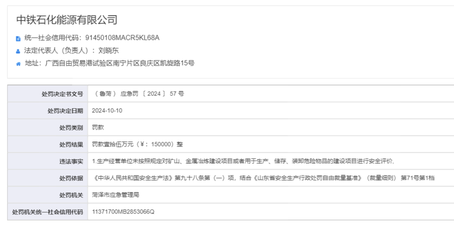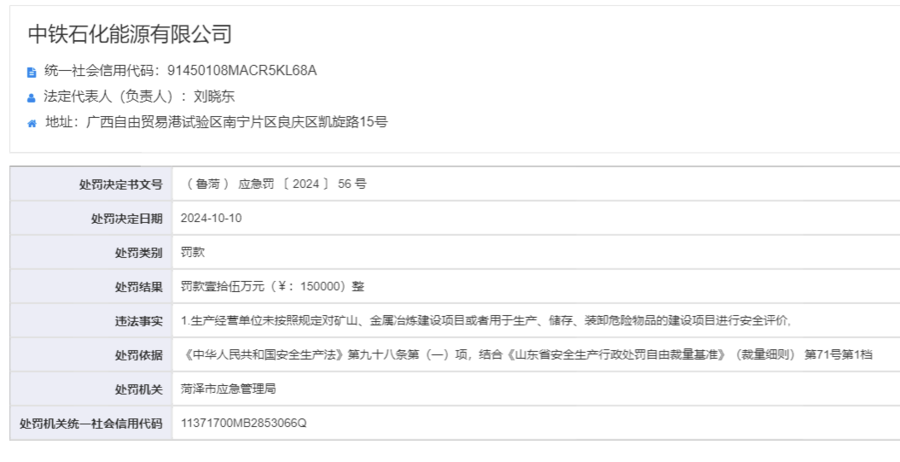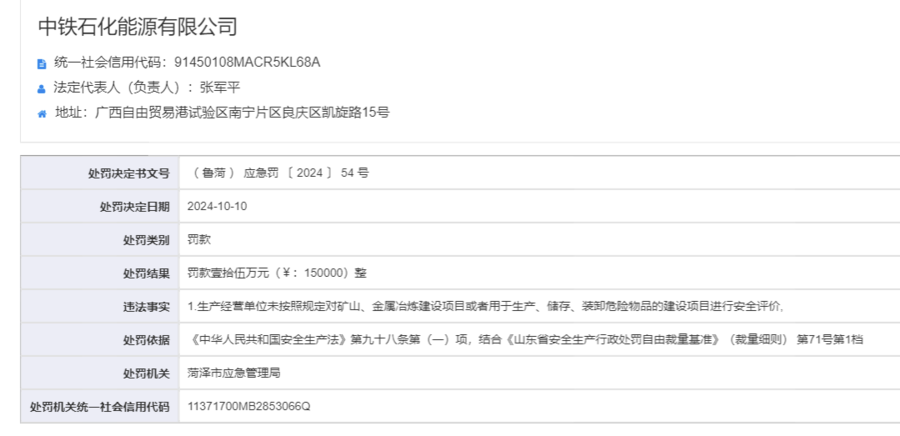 日前,中铁石化能源有限公司收到菏泽市应急管理局四张罚单,罚款总计60万元。