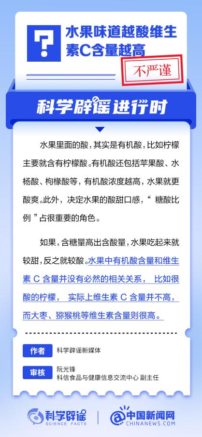 水果味道越酸维生素C含量越高吗? 中国新闻网 2024-10-25 5428 水果里面的酸,其实是有机酸,比如柠檬主要就含有柠檬酸,有机酸还包括苹果酸、水杨酸、枸椽酸等。 水果中有机酸含量和维生素C含量并没有必然的相关关系,比如很酸的柠檬,实际上维生素C含量并不高,而大枣、猕猴桃等维生素含量则很高。 责任编辑:消费频道张妍