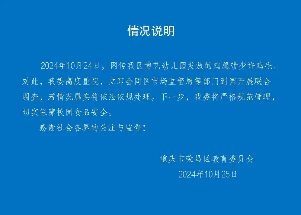 重庆荣昌通报“幼儿园发的鸡腿带鸡毛”:立即开展联合调查