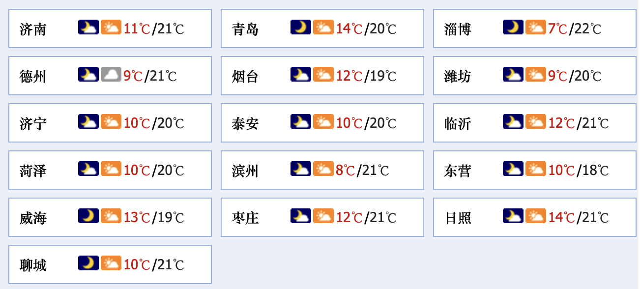 最高气温:鲁中山区和北部沿海地区19℃左右,其他地区21℃左右。