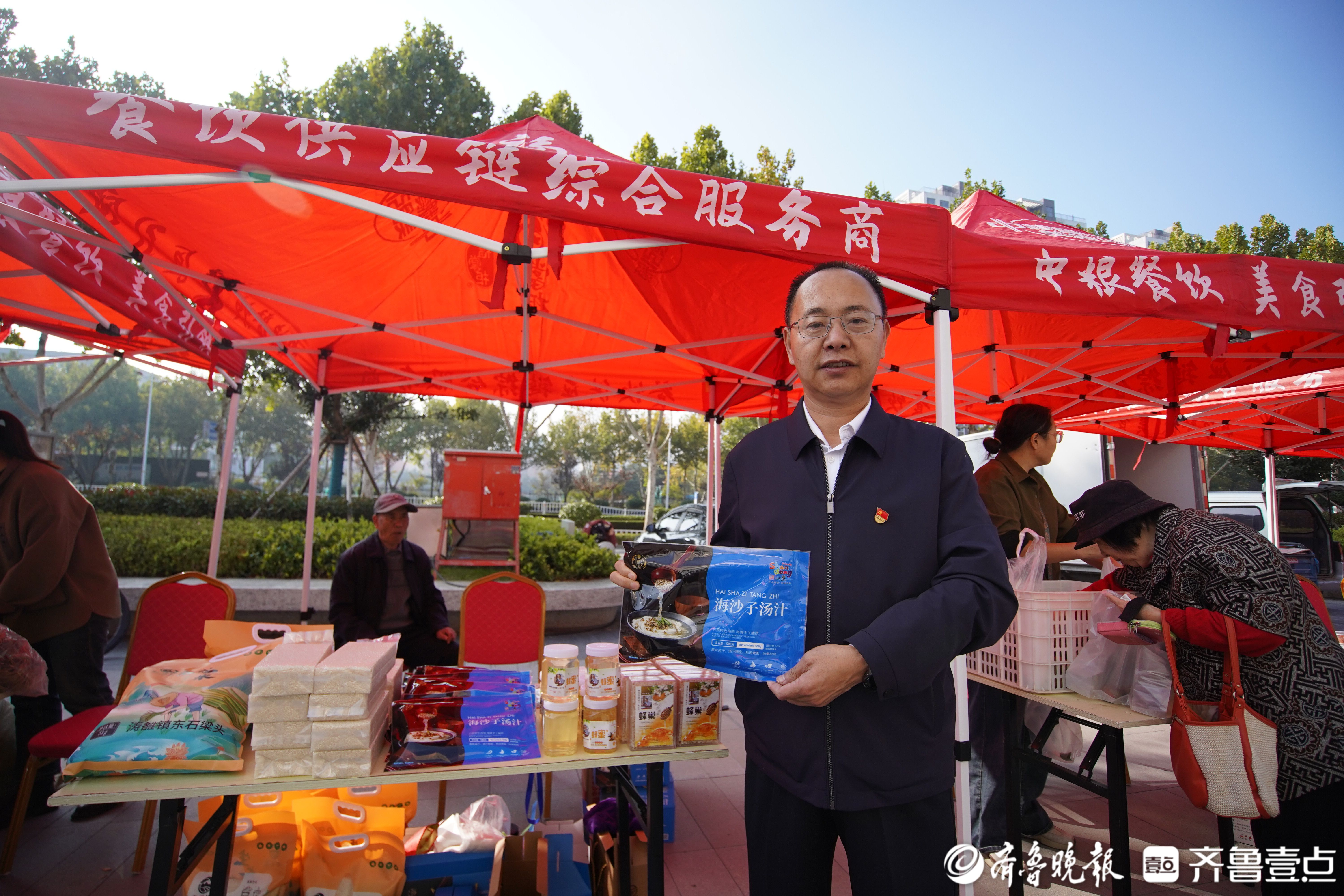 “我们今天带来了村集体合作社的大米、海沙子、蜂蜜、蜂巢等农副产品,海沙子汤汁特别受欢迎,卖得很好!”山东海洋文化旅游发展集团派驻东港区涛雒镇东石梁头村第一书记赵中华开心地说。