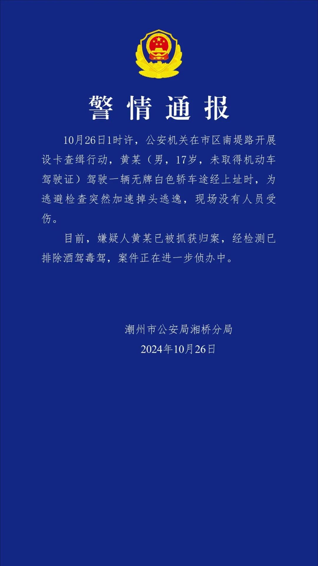 10月26日1时许,公安机关在市区南堤路开展设卡查缉行动,黄某(男,17岁,未取得机动车驾驶证)驾驶一辆无牌白色轿车途经上址时,为逃避检查突然加速掉头逃逸,现场没有人员受伤。目前,嫌疑人黄某已被抓获归案,经检测已排除酒驾毒驾,案件正在进一步侦办中。