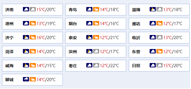 最高气温:鲁中山区和北部沿海地区15℃左右,鲁南地区20℃左右,其他地区18℃左右。