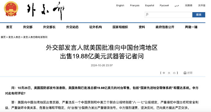 10月26日,外交部发言人就美国批准向中国台湾地区出售19.88亿美元武器答记者问。
