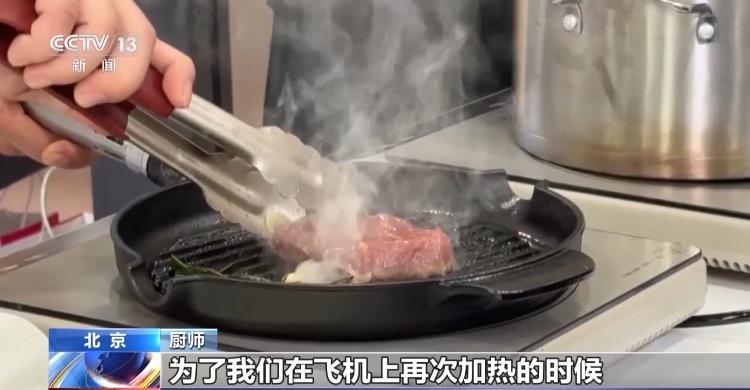 厨师:这个牛排只是三成熟,是为了我们在飞机上再次加热的时候,能变成五六成熟,让客人吃的时候鲜嫩可口。火候不太好掌控,但是我们航食已经研制了一系列流程,让我们每个员工都可以掌握好火候。