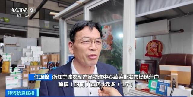 浙江宁波农副产品物流中心蔬菜批发市场经营户 任现峰:黄瓜前段时间4元多一斤,现在降到2元多,降了一半。(央视财经)