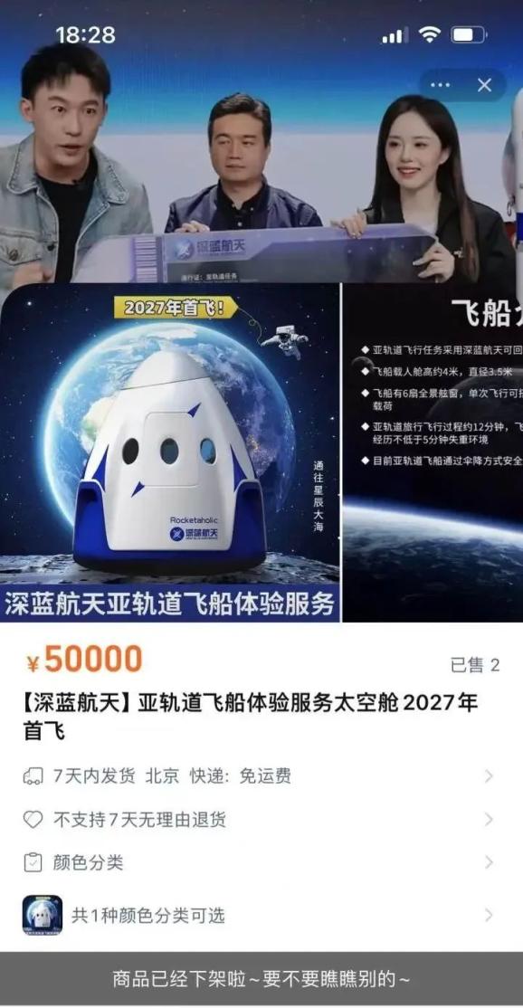 此次用户在淘宝交付订金(5万元,这笔预付款将被计入总价)后,还需在线下与深蓝航天签署合同才能正式生效。合同生效后,旅客因个人原因,可以提前半年免费改签一次。