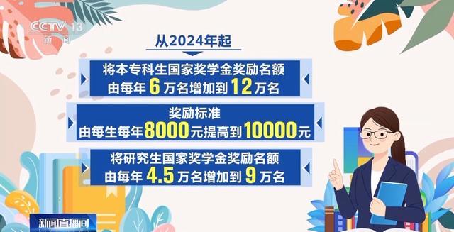 本专科生国家奖学金奖励名额由每年6万名增加到12万名,奖励标准由每生每年8000元提高到10000元;研究生国家奖学金奖励名额由每年4.5万名增加到9万名。