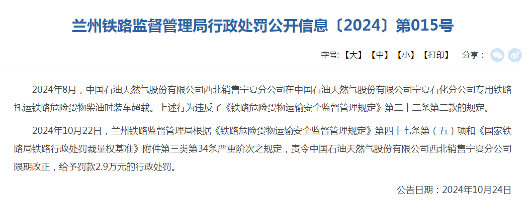 2024年10月22日,兰州铁路监督管理局根据《铁路危险货物运输安全监督管理规定》第四十七条第(五)项和《国家铁路局铁路行政处罚裁量权基准》附件第三类第34条严重阶次之规定,责令中国石油天然气股份有限公司西北销售宁夏分公司限期改正,给予罚款2.9万元的行政处罚。